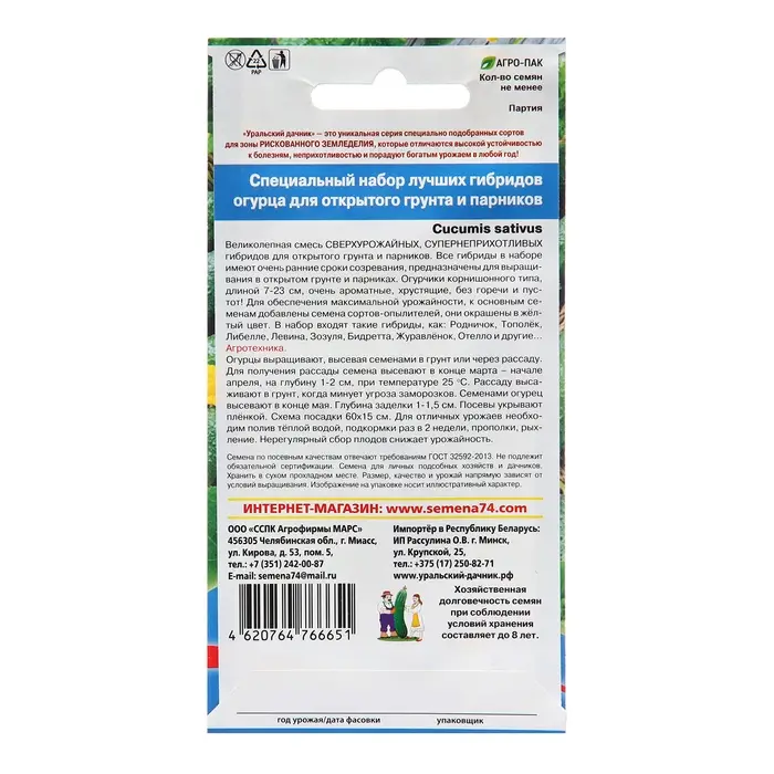 Великолепная смесь сверх урожайных, супер неприхотливых гибридов для открытого грунта и парников. Все гибриды в имеют очень ранние сроки созревания, преимущественно женский тип цветения, предназначены для выращивания в открытом грунте и парниках. Огурчики корнишонного типа, длинной 7-23 см., очень ароматные, хрустящие, без горечи и пустот! Для обеспечения максимальной урожайности, к основным семенам добавлены семена сортов – опылителей, они окрашены в жёлтый цвет. В набор входят такие гибриды, как Родничок, Тополёк, Либелле, Левина, Зозуля, Бидретта, Журавлёнок, Отелло и другие...