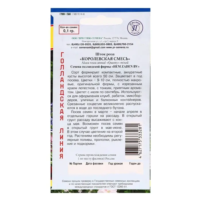 Семена Шток-роза Королевская смесь формируют роскошные компактные кусты высотой всего 60 см, что весьма необычно для, преимущественно, высокорослых шток-роз. При рассадном методе выращивания цветет в год посева, что также необычно для двулетников, к которым причисляют штокрозы.