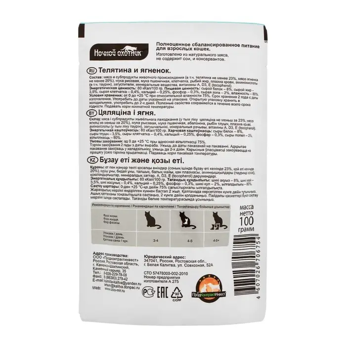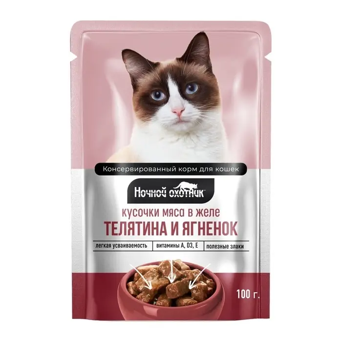 Влажный корм "Ночной охотник" для кошек, телятина/ягненок в желе, пауч, 100 г