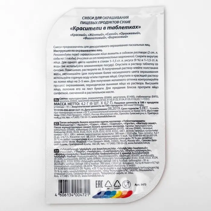 Каждая таблетка окрашивает яйца ярко и равномерно, обеспечивая стойкий и насыщенный цвет, который не смывается.