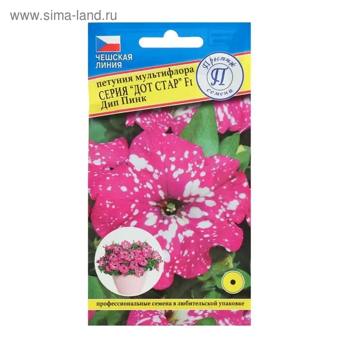 Однолетник. Бесконечную вселенную, звездное небо, тайны космоса, или простую радость и веселое настроение на Ваших клумбах, подоконниках или в вазонах могут производить своим необыкновенным видом уникальные гибриды новейшей серии «Дот Стар Е1». Сочетание ярких и насыщенных окрасок цветков и белых крапинок или пятнышек дают цветкам совершенно новый и необыкновенно привлекательный вид. При жаркой или изменчивой погоде меняется форма, частотность и интенсивность белых рисунков на лепестках так, что каждый цветок является неповторимым оригиналом. Растения высотой 30-35 см, отлично ветвятся, обильно цветут, цветки диаметром 6-7 —см насыщенно-розового цвета с белыми крапинками и пятнышками, пригодны для цветников, балконных ящиков и контейнеров. После сильного дождя они способны быстро восстановить свой великолепный внешний вид.