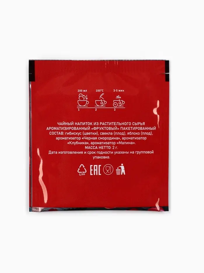 Состав: гибискус (цветки), свекла (плод), яблоко (плод), ароматизатор "Чёрная смородина", ароматизатор "Клубника", ароматизатор "Малина".