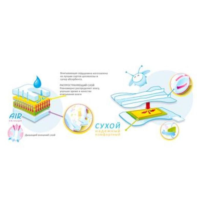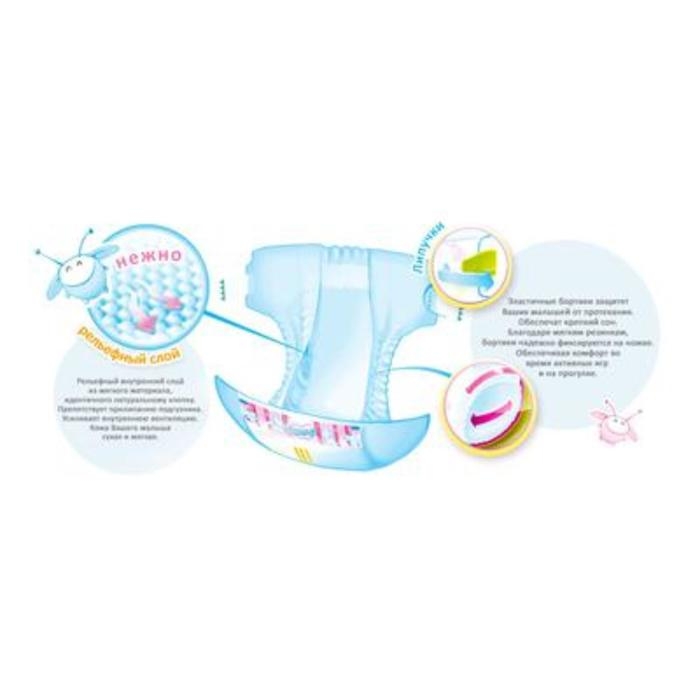 - Эластичные бортики защитят малыша от протекания. Благодаря мягким резинкам подгузник надёжно фиксируется на ножках, обеспечивая комфорт во время активных игр и на прогулке.