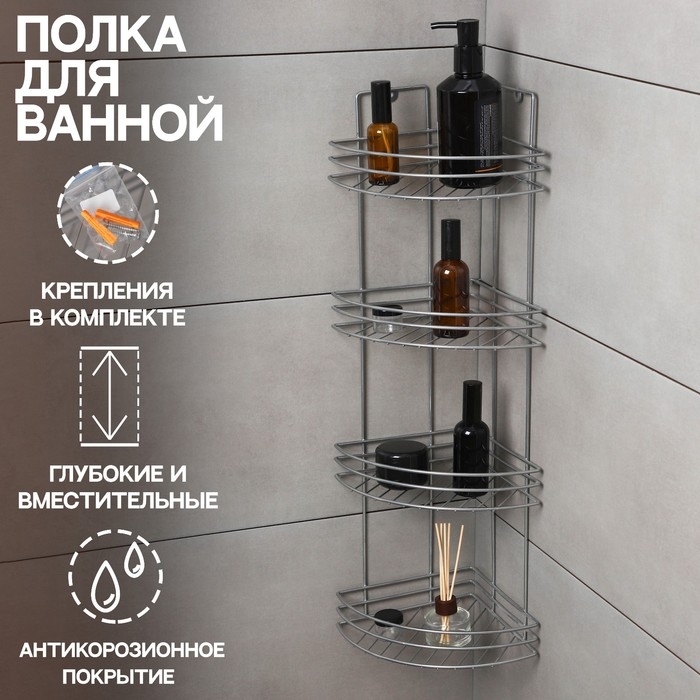 Угловая 4-х ярусная полка — удобный и вместительный аксессуар для ванной комнаты. Подходит для хранения небольших полотенец, косметических и хозяйственных средств.