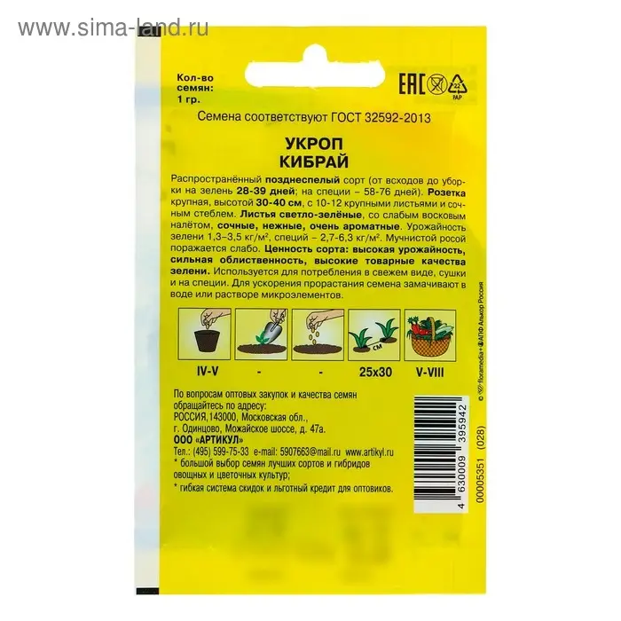 Семена Укроп "Кибрай" кустовой, позднеспелый, 1 г