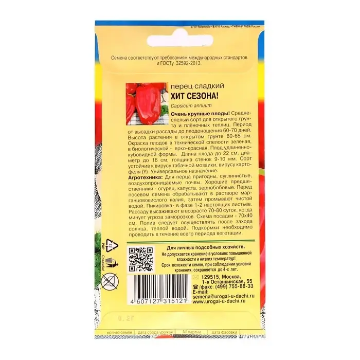 Очень крупные плоды! Среднеспелый сорт для открытого грунта и плёночных теплиц. Период от высадки рассады до плодоношения 60-70 дней. Высота растения в открытом грунте 60-65 см. Окраска плодов в технической спелости зеленая,в биологической - ярко-красная. Плод удлиненно-кубовидной формы. Длина плода до 22 см,диаметр до 16 см,толщина стенок 9-10 мм. Сорт устойчив к вирусу табачной мозаики,вирусу картофеля (Y). Универсальное назначение.