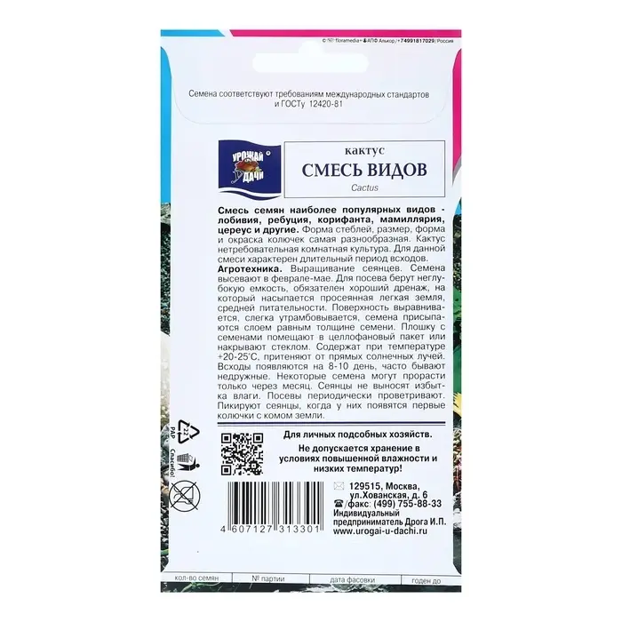 Семена комнатных цветов Кактус "Непоседа", ц/п, 0,05 г
