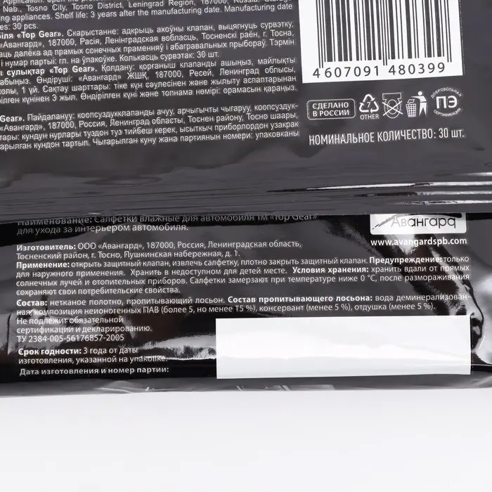 Влажные салфетки Top Gear, для салона автомобиля, 30 шт.