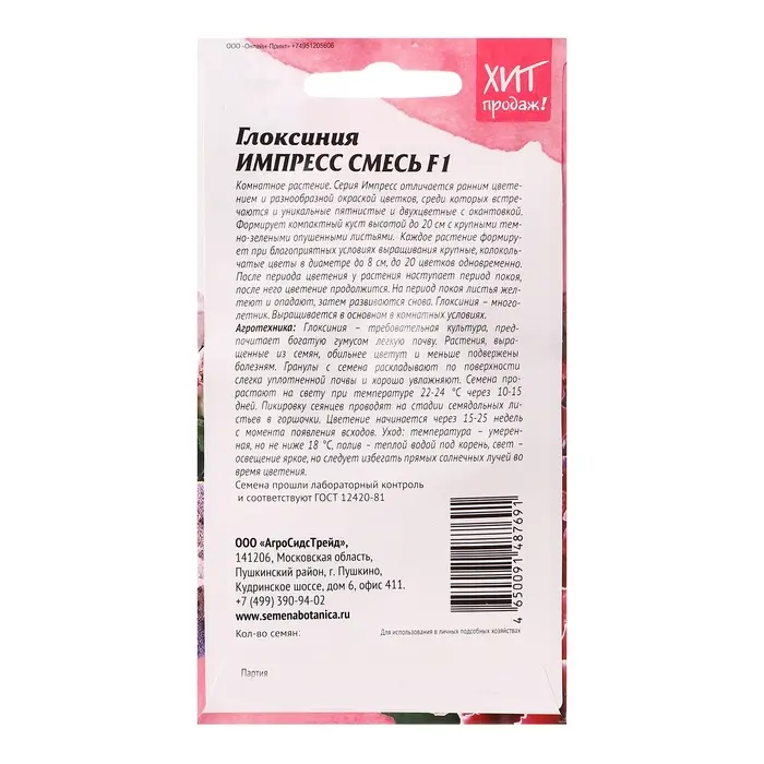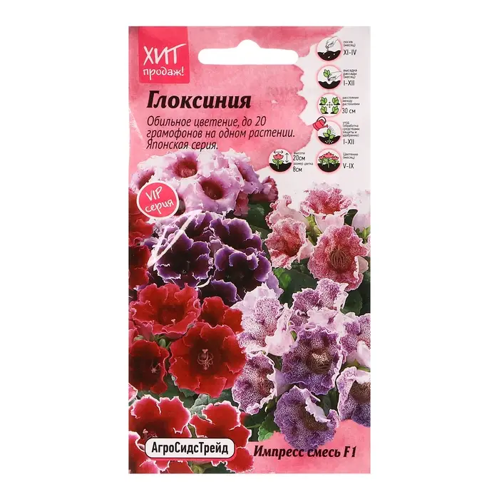 Комнатное растение. Серия ИМПРЕСС отличается ранним цветением и разнообразной окраской цветков, среди которых встречаются и уникальные пятнистые и двухцветные с окантовкой. Формирует компактный куст высотой до 20 см с крупными темно-зелеными опушенными листьями. Каждое растение формирует при благоприятных условиях выращивания крупные, колокольчатые цветы в диаметре до 8 см, до 20 цветков одновременно. После периода цветения у растения наступает период покоя, после него цветение продолжится. На период покоя листья желтеют и опадают, затем - развиваются снова. Глоксиния - многолетник. Выращивается в основном в комнатных условиях Агротехника: Глоксиния – требовательная культура, предпочитает богатую гумусом легкую почву. Растения, выращенные из семян, обильнее цветут и меньше подвержены болезням. Гранулы с семена раскладывают по поверхности слегка уплотненной почвы и хорошо увлажняют. Семена прорастают на свету при температуре 22-24°С через 10-15 дней. Пикировку сеянцев проводят на стадии семядольных листьев в горшочки. Цветение начинается через 15-25 недель с момента появления всходов. Уход: температура - умеренная, но не ниже 18°С, полив – теплой водой под корень, свет – освещение яркое, но следует избегать прямых солнечных лучей во время цветения. Штрих-код -