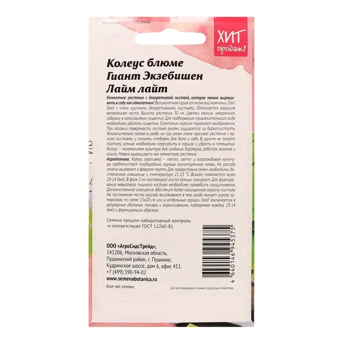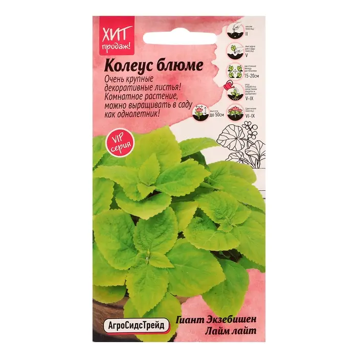 Комнатное растение с декоративной листвой, которое можно выращивать в Саду как однолетник! Великолепная серия от японской компании Takii Seed с очень крупными декоративными листьями. Отличается хорошим ветвлением куста. Высота растения 50 см. Цветки мелкие, невзрачные, собраны в колосовидное соцветие. Для поддержания привлекательного вида необходимо удалять соцветия. Сочетания окрасок поражают воображение. При касании поверхности листьев руками ощущается их бархатистость. Исключительно легкое в уходе, но при этом очень красивое растение с яркими листьями и сочными стеблями для дома и сада. В грунте не зимует, поэтому осенью необходимо пересадить в горшок и убрать в помещение. Колеус – незаменимая культура для создания бордюров, рабаток, вазонов и кашпо. Можно выращивать как комнатное растение. Агротехника: Колеус (крапивка) – тепло-, свето- и влаголюбивая культура, предпочитает плодородные хорошо окультуренные почвы. На рассаду семена высевают в феврале-марте. Для прорастания семян необходимо достаточное освещение и температура 21-25˚С. Всходы появляются через 10-14 дней. В фазе 2-го настоящего листа сеянцы пикируют. Для формирования невысокого пышного кустика необходимо проводить прищипывание. Дополнительное освещение обеспечит более насыщенную окраску листьев. На постоянное место рассаду высаживают в мае, когда минует угроза заморозков, по схеме 15х20 см или в отдельные горшки. Уход заключается в регулярных обильных поливах и опрыскиваниях, подкормках каждые 10-14 дней и формирующих обрезках. Штрих-код -
