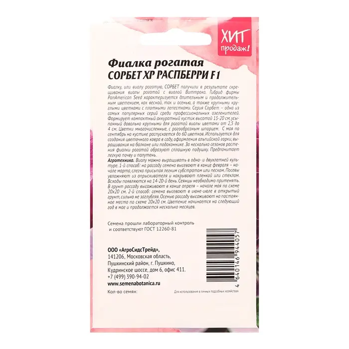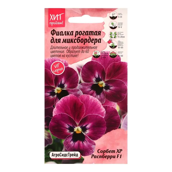 Фиалку, или виолу рогатую СОРБЕТ получили в результате скрещивания виолырогатойс виолой Виттрока. Гибрид фирмы PanAmerican Seed характеризуется длительным и продолжительным цветением, как весной, так и осенью, а также крупными круглыми цветками с плотными лепестками. Серия Сорбет - одна из самых популярных серий среди профессиональных озеленителей. Формирует компактный аккуратный кустик высотой 15-20см, усыпанный довольно крупными длярогатой виолы цветами от 2,5 до 4см. Цветки многочисленные, с рогообразным шпорцем. С мая по сентябрь на кустике распускается до 60 цветков. Используется создания цветочного ковра в саду, оформления альпийской горки, выращивания на балконе или подоконнике. За несколько сезонов растения фиалки рогатойобразуют сплошную подушку. Предпочитает легкую почву и полутень. Агротехника: Виолу можно выращивать в одно- и двухлетней культуре. 1 способ: на рассаду семена высевают в конце февраля – начале марта, слегка присыпая легким субстратом или песком. Посевы увлажняют из опрыскивателя и накрывают пленкой или стеклом. Всходы появляются на 14-20 день. Сеянцы необходимо притенять. В грунт рассаду высаживают в конце апреля – начале мая по схеме 20х20 см. 2 способ: семена высевают в июне-июле в открытый грунт, сильно не заглубляя. Осенью рассаду высаживают на постоянное место по схеме 20х20 см. Цветение начинается на следующий год в мае и продолжается несколько месяцев.