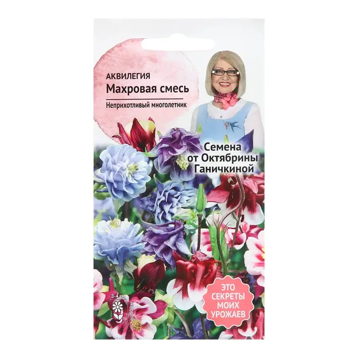 Многолетнее травянистое растение высотой до 80 см с ажурными серо-зелеными листьями и изящными цветками-колокольчиками. Цветки махровые, диаметром 3-4 см, разнообразных окрасок. Цветение обильное, с конца мая по июль. Аквилегия широко используется в групповых посадках многолетников, в миксбордерах, рабатках, а также на срезку. Агротехника: Аквилегия – зимостойкое, теневыносливое, влаголюбивое растение, предпочитает легкие плодородные, хорошо увлажненные почвы. На рассаду семена высевают в марте на глубину 0,5 см. Всходы появляются через 2-3 недели. Пикировку проводят в фазе 1-2 настоящих листьев. На постоянное место рассаду высаживают в мае на расстоянии 25-30 см. В открытый грунт семена высевают в мае, а для подзимнего посева - в августе, при этом цветение наступает на следующий год. На одном месте выращивается 3-5 лет. Штрих-код - 4660010777390