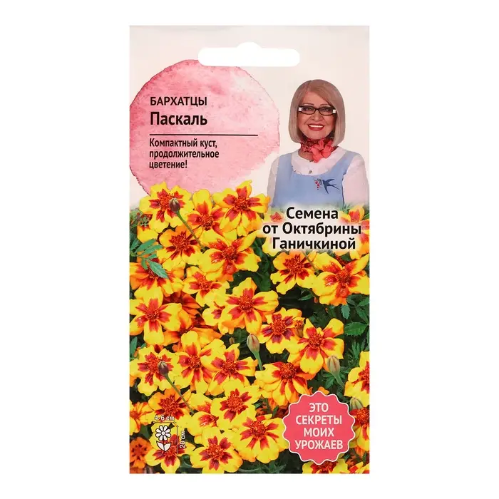 Однолетник. Растение формирует супер-компактный кустик высотой 20 см. Соцветия простые, диаметром 4-6 см. Каждый цветок цветет около 2 недель, благодаря этому кустик полностью усыпан яркими желто-красными цветками. Сорт отличается обильным и продолжительным цветением, которое длится с середины июня до октября. Бархатцы великолепно смотрятся в цветниках, группами на газонах и рабатках, а также в контейнерной культуре. Агротехника: Бархатцы – теплолюбивая культура, предпочитает плодородные хорошо окультуренные почвы. На рассаду семена высевают в начале апреля или в середине мая в открытый грунт. Всходы появляются через 5-8 дней. При необходимости сеянцы пикируют. На постоянное место рассаду высаживают в мае, когда минует угроза заморозков, по схеме 15х30 см. Штрих-код - 4660010777925