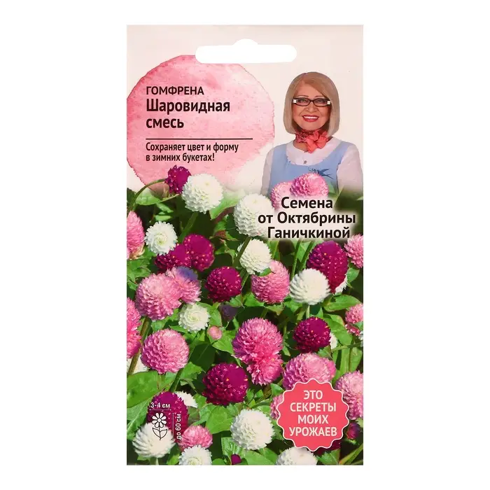 Однолетнее сильно ветвящееся травянистое растение высотой до 60 см. Очаровательные цветы хорошо сохраняют цвет и форму, поэтому широко используется в зимних букетах. Образует эффектные гвоздикообразныые, с пленчатыми прицветниками цветы различных ярких окрасок, до 3-4 см в диаметре. Цветет гомфрена довольно долго, с июля по сентябрь. Используется для посадки в клумбах, рабатках, бордюрах, как горшечная культура. Агротехника: Гомфрена – светолюбивое, холодо- и засухоустойчивое растение, предпочитает рыхлые питательные почвы. Посев семян на рассаду проводят в марте. Всходы появляются на 14-16 день. Через 2 недели после появления всходов проводят пикировку. В открытый грунт рассаду высаживают в середине мая на расстоянии 20-25 см. Уход заключается в своевременных поливах, рыхлении и регулярных подкормках. Штрих-код -