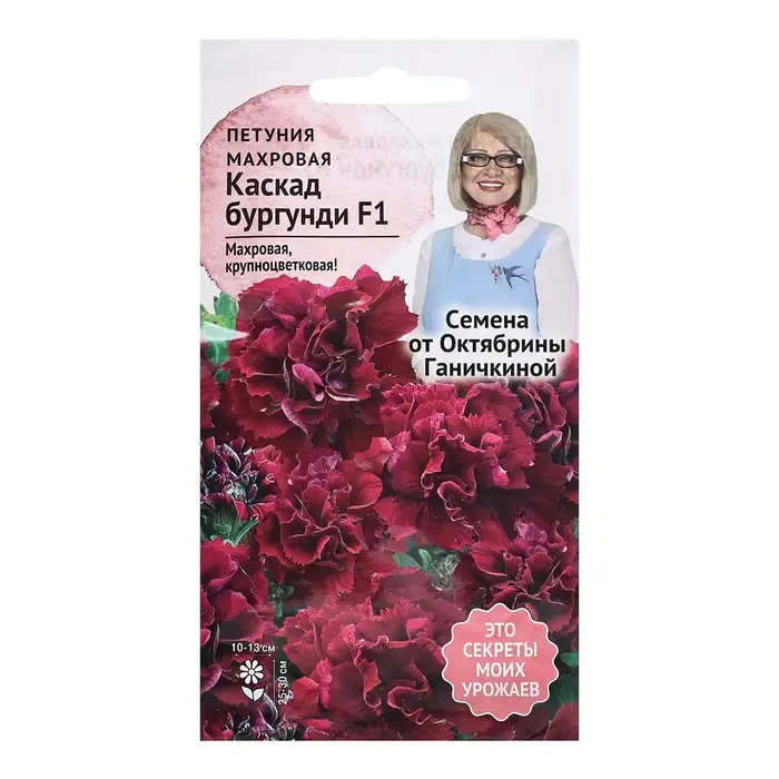 Куст компактный, высотой 25-30 см, с небольшими аккуратными листочками и огромными цветками диаметром 10-13 см. Цветки махровые, насыщенного вино-красного цвета, с сильно гофрированными лепестками. Используется для оформления клумб, вазонов, кашпо и балконных ящиков. Агротехника: Семена покрыты оболочкой! Петуния – мелкосемянная культура, требовательная к условиям выращивания. Посев на рассаду в феврале-марте. Гранулы располагают на поверхности субстрата, не засыпая их почвой, а лишь слегка прижимают и накрывают стеклом или пленкой. Для прорастания семян необходимо хорошее освещение и температура 20-24˚С. Полив производят из опрыскивателя. Всходы появляются на 10-15 день. После появления первого настоящего листа всходы проветривают, периодически снимая стекло и убирая конденсат влаги. Температуру постепенно снижают до 14-16˚С и следят, чтобы не было переувлажнения субстрата. Закаленную рассаду высаживают в грунт по схеме 15×20 см. В дальнейшем уход заключается в рыхлении, поливе и подкормах. Штрих-код - 4660010772999