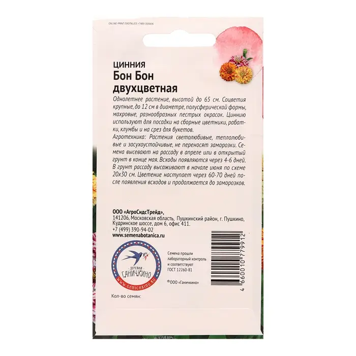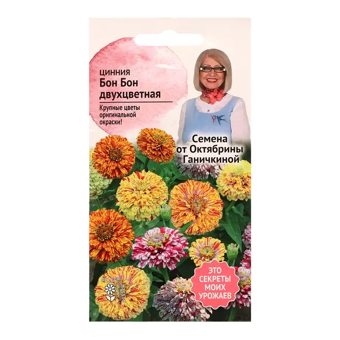 Однолетнее растение, высотой до 65 см. Соцветия крупные, до 12 см в диаметре, полусферической формы, махровые, разнообразных пестрых окрасок. Циннию используют для посадки на сборные цветники, рабатки, клумбы и на срез для букетов. Агротехника: Растения светолюбивые, теплолюбивые и засухоустойчивые, не переносят заморозки. Семена высевают на рассаду в апреле или в открытый грунт в конце мая. Всходы появляются через 4 - 6 дней. В грунт рассаду высаживают в начале июня по схеме 20x30 см. Цветение наступает через 60-70 дней после появления всходов и продолжается до заморозков. Штрих-код - 4660010779912