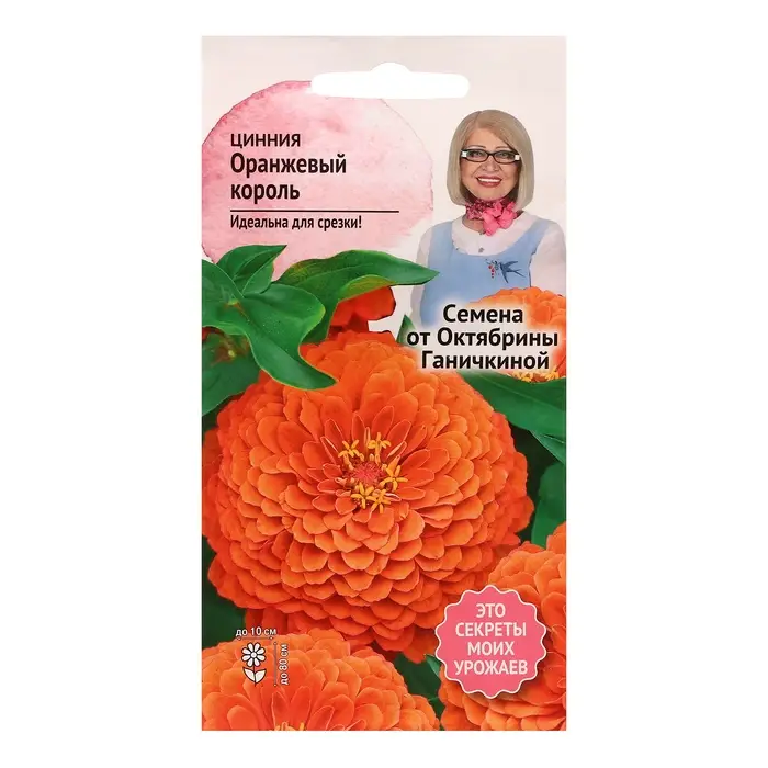 Однолетник. Растения высотой до 80 см с крупными оранжевыми георгиновидными соцветиями диаметром до 10 см. Циннию используют для посадки на сборные цветники, рабатки, клумбы и на срез для букетов. Агротехника: Растения светолюбивые, теплолюбивые и засухоустойчивые, не переносят заморозки. Семена высевают на рассаду в апреле или в открытый грунт в конце мая. Всходы появляются через 4 - 6 дней. В грунт рассаду высаживают в начале июня по схеме 20x30 см. Цветение наступает через 60-70 дней после появления всходов и продолжается до заморозков. Штрих-код - 4660010770520