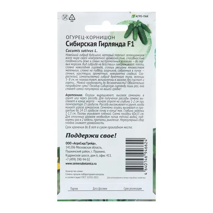 Семена Огурец "Сибирская Гирлянда" F1 скороспелый, партенокарпический, 5 шт