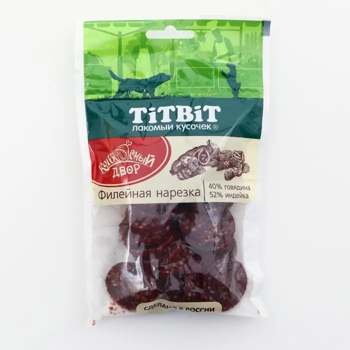 Колбасный двор для собак TitBit – это высококачественные мясные деликатесы, которые отлично подходят в качестве поощрения животного или просто побаловать своего любимца. Содержание мяса и мясных субпродуктов 92%. Не содержат соль и искусственных компонентов. Единственные мясные колбасы, представленные в виде нарезки!