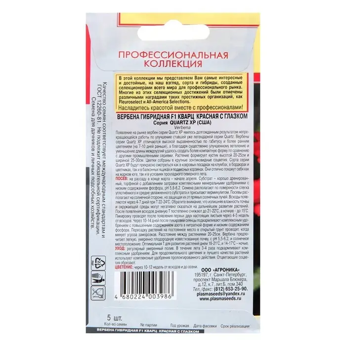 Семена цветов Вербена «Кварц красная с глазком», F1, гибридная, ранняя, 5 шт., однолетник, «Агроника»