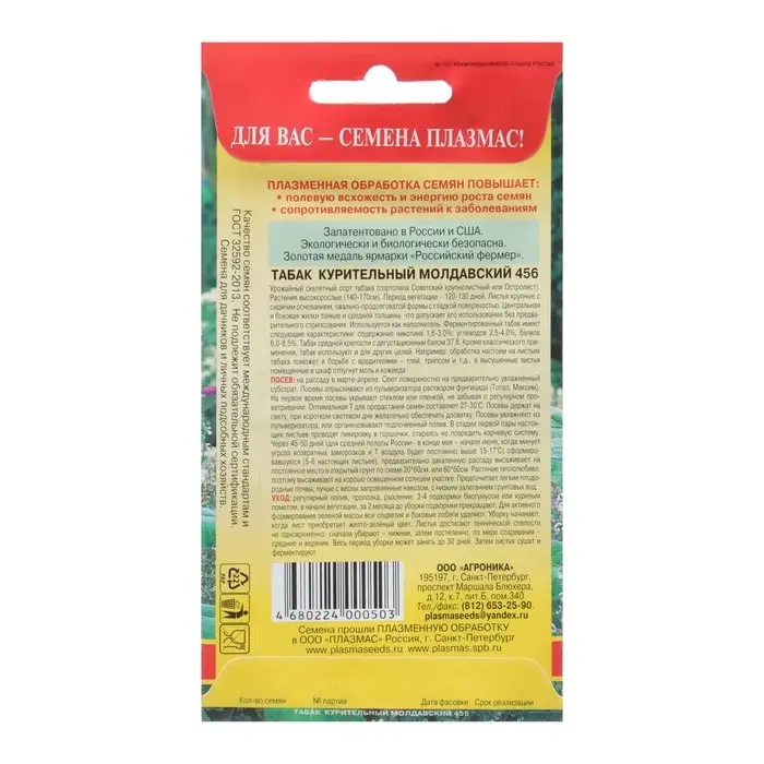 Табак Курительный Молдавский 456 - урожайный скелетный сорт табака. Листья крупные с сидячим основанием, овально-продолговатой формы с гладкой поверхностью. Центральная и боковая жилки тонкие и средней толщины, что допускает его использование без предварительного стрипсования. Используется как наполнитель. Табак средней крепкости. Кроме классического применения, табак используют и для других целей. Например: обработка настоем на листьях табака поможет в борьбе с вредителями- тлёй, трипсом и др., а высушенные листья помещённые в шкаф отпугнут моль и кожееда.