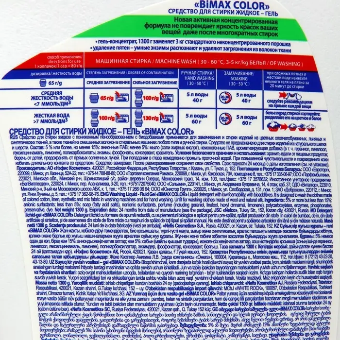 Способ применения: При среднем загрязнение берем 65 г порошка, при сильном загрязнение 100 г порошка.( средняя жесткость воды). Ручная стирка берем 5 л воды и 40 гр порошка. При среднем загрязнение берем 100г порошка и сильном загрязнение 130 г порошка. ( жесткая вода). Ручная стирка берем 5 л воды и 60 гр порошка.