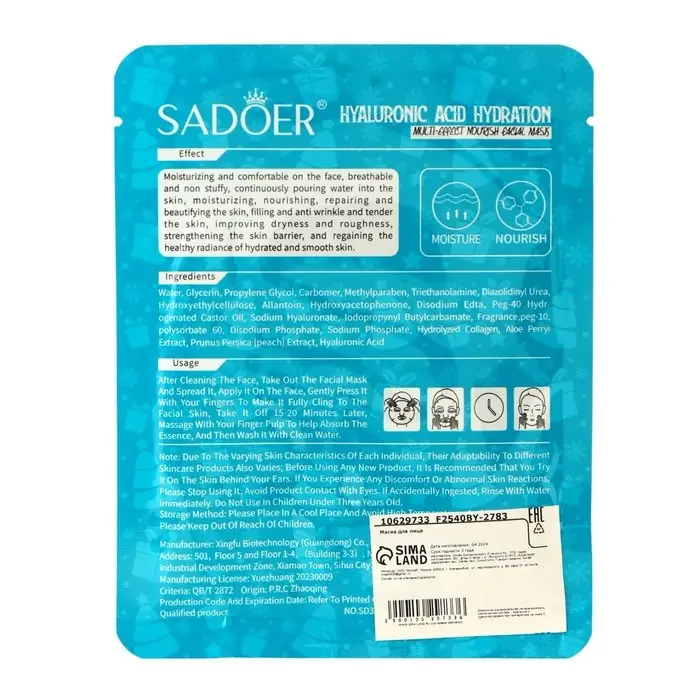 Способ применения: аккуратно расправьте маску и наложите её на лицо, плотно прижав к коже. Оставьте маску на 15-20 минут. Снимите маску и аккуратно помассируйте оставшуюся эссенцию до полного впитывания. При необходимости нанесите увлажняющий крем.