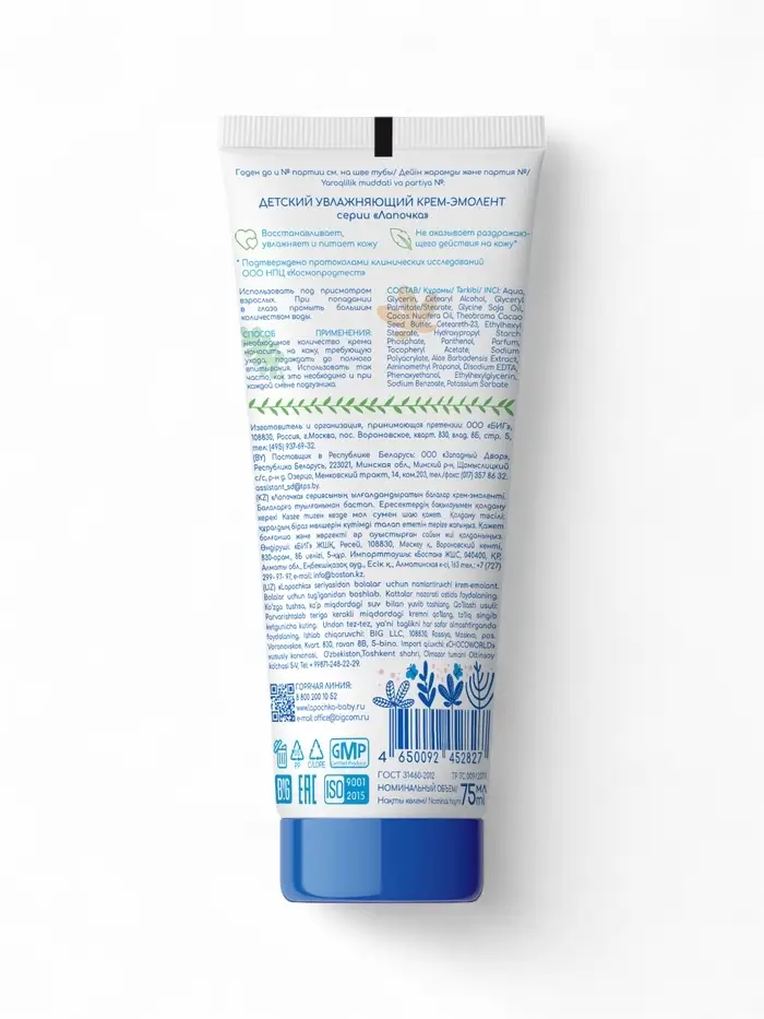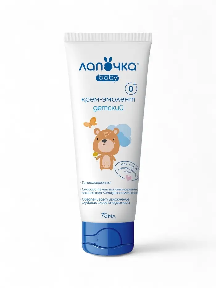 Детский крем-эмолент Лапочка - эмульсия специального типа, рекомендованного для детской косметики. Не содержит красителей, гормонов, парабенов, аллергенов.