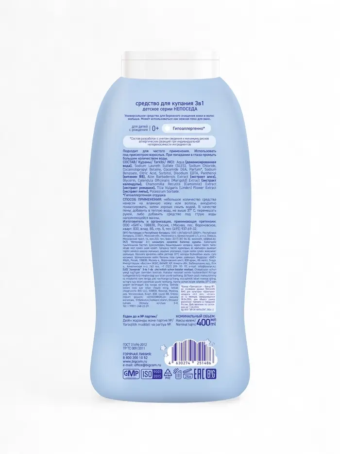 Не сожержит SLS, парабены, метилы, красители и аллергены. Бережное очищение от макушки до самых пяточек, а так же нежная пена для принятия вечерней ванны - все в одном флаконе.