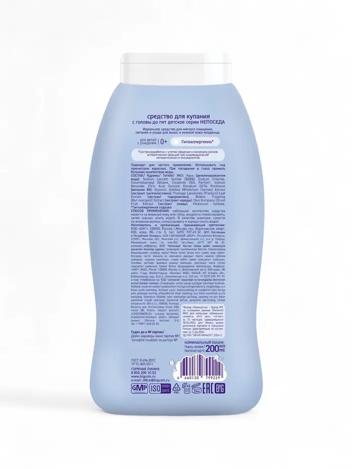 Не сожержит SLS, парабены, метилы, красители и аллергены. Бережное очищение от макушки до самых пяточек, а так же нежная пена для принятия вечерней ванны - все в одном флаконе.