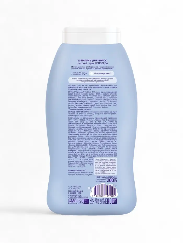 Благодаря Д-пантенолу и комплексу натуральных экстрактов ромашки и календулы, мягкий шампунь не только бережно очищает нежные волосы и кожу, но так же обеспечивает увлажнение и питание кожи и волос, способствует снятию сухости и раздражений. Состав разработан с учетом сведения к минимуму рисков аллергических реакций при индивидуальной непереносимости ингредиентов.
