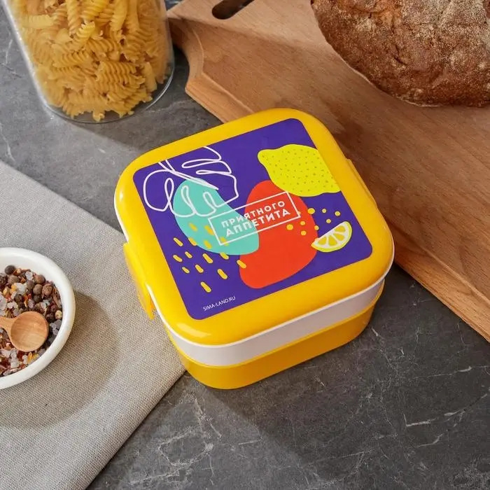Герметичная крышка с защелками обеспечивает удобство использования и гарантирует сохранность пищи. Яркий желтый цвет ланч-бокса и интересный дизайн на крышке добавляют этому аксессуару стиля и яркости.
