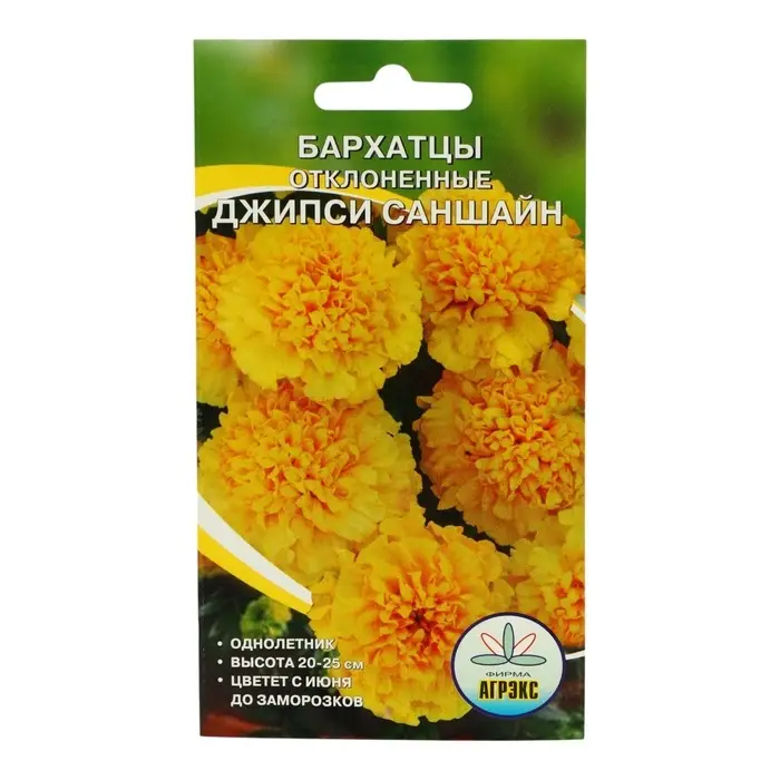 Семена бархатцев отклоненных махровых Джипси саншайн (dzhipsi sanshayn) высевают на рассаду в марте-апреле в парник. На постоянное место высаживают в начале июня. Бархатцы Джипси саншайн цветут с июля по октябрь небольшими (3-4 сантиметра в диаметре) махровыми соцветиями насыщенно-желтой окраски. Высота растения 25 сантиметров. Кустики густые, с темно-зелеными листьями. Используя этот сорт, можно создать красивую желтую лужайку на участке и высветлить солнечным пятном притененные уголки сада.