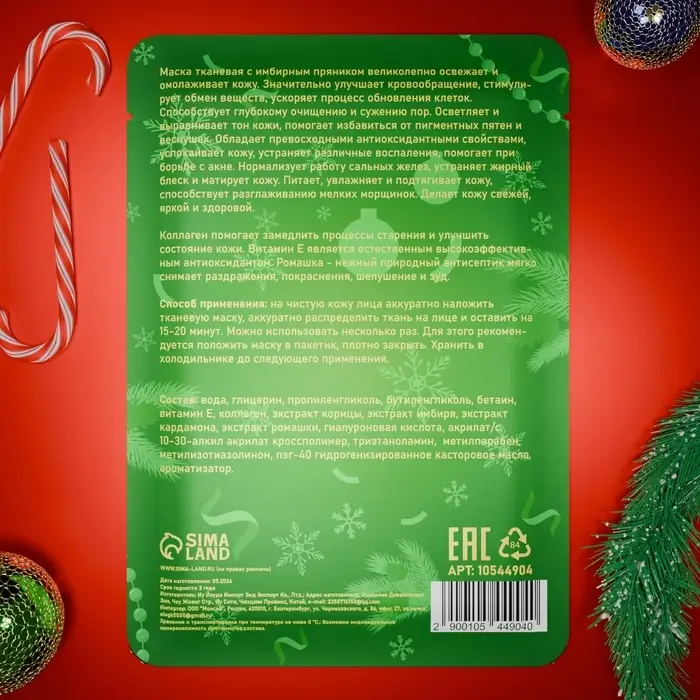 Новогодняя маска для лица, тканевая, увлажняющая, с ароматом имбирного пряника