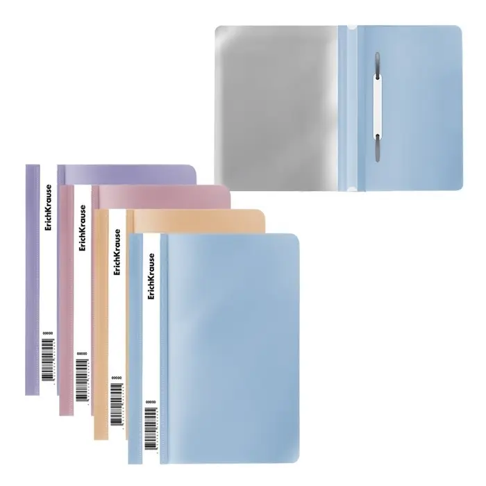 Папка-скоросшиватель формата А5+ из высококачественного пластика с текстурой поверхности "софт-тач", на которой не видно отпечатков пальцев и мелких царапин. Предназначена для быстрого сшивания, хранения и просмотра документов. Цвет папки – ассорти: бежевый, голубой, розовый, фиолетовый. Механизм - механический скоросшиватель; прозрачный верхний лист; усиленный пластиковый корешок с прозрачной полосой для информационной карточки. Размер - 230х170мм, толщина верхнего листа - 0.12мм, толщина нижнего листа - 0.18мм. Код и баркод на каждой единице товара