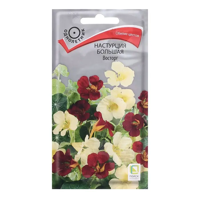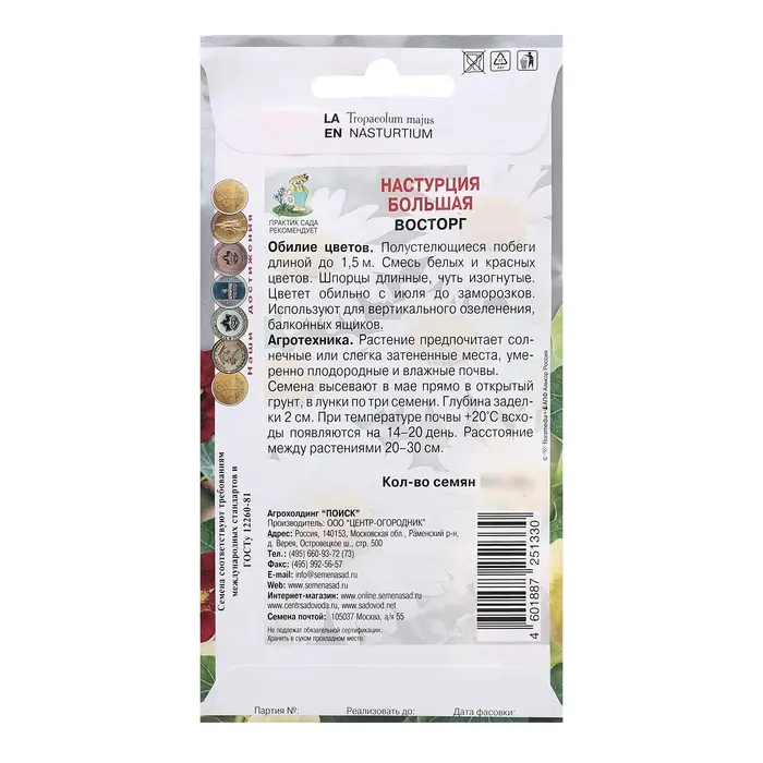 Обилие цветов. Полустелющиеся побеги длиной до 1,5 м. Смесь белых и красных цветов. Шпорцы длинные, чуть изогнутые. Цветет обильно с июля до заморозков. Используют для вертикального озеленения, балконных ящиков.Агротехника. Растение предпочитает солнечные или слегка затененные места, умеренно плодородные и влажные почвы. Семена высевают в мае прямо в открытый грунт, в лунки по три семени. Глубина заделки 2 см. При температуре почвы +20°C всходы появляются на 14-20 день. Расстояние между растениями 20-30 см.Семена соответствуют требованиям международных стандартов и ГОСТу РФ 12260-81.