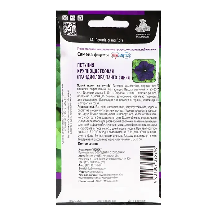 Яркий акцент на клумбе! Растения компактные, хорошо ветвящиеся, выравненные по габитусу. Высота растения – 25-35 см. Диаметр цветка 8-10 см. Окраска - синяя. Цветение раннее, обильное с июня до осенних заморозков. Идеально подходит для озеленения. Используют для посадки в горшки, контейнеры и открытый грунт.Агротехника. Растение светолюбивое, засухоустойчивое, хорошо растет на любых питательных почвогрунтах. Посев семян на рассаду проводят в феврале-марте. Семена слегка вдавливают в почву, землей не присыпают. Посадочную емкость накрывают стеклом и ставят в освещенное место. При температуре почвы +18-20°C всходы появляются на 14-20 день. Сеянцы пикируют в фазе 2-х настоящих листьев. Рассаду высаживают в открытый грунт после окончания весенних заморозков.Семена соответствуют требованиям международных стандартов и ГОСТу РФ 12260-81