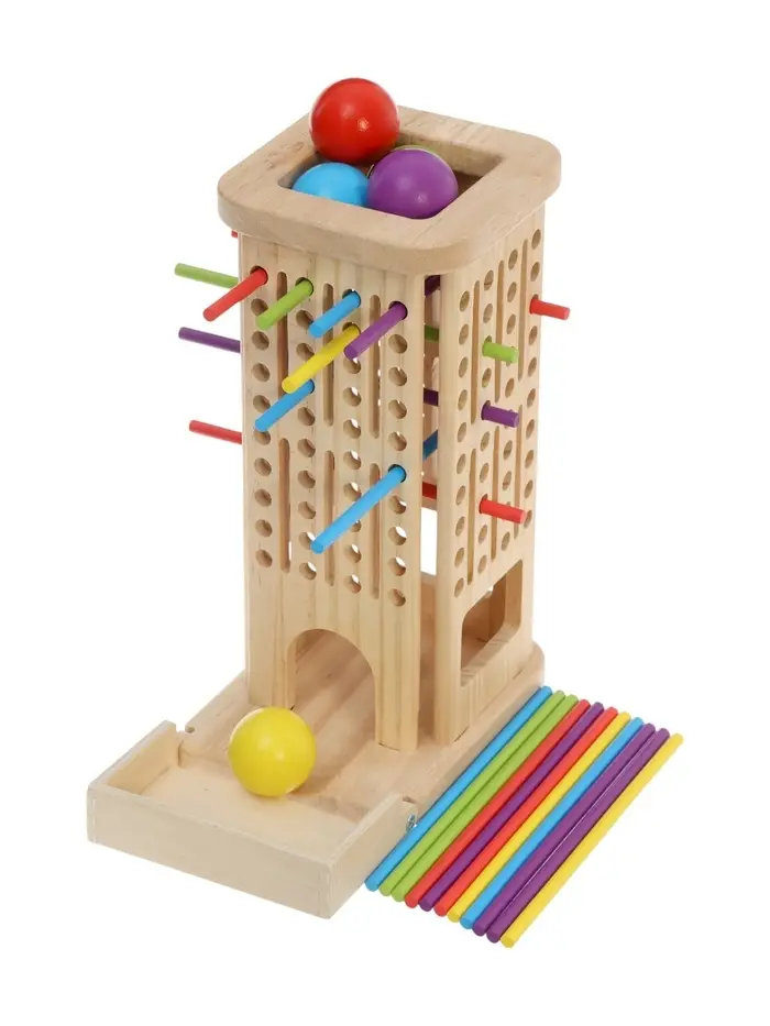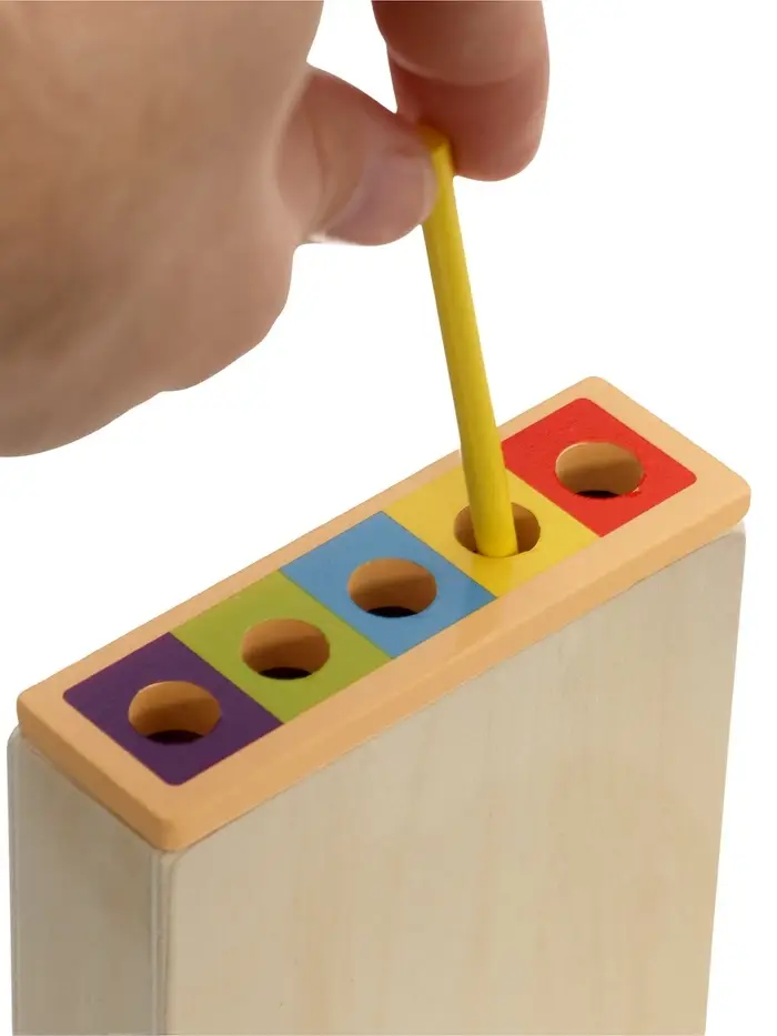 - Простая механика: ребёнок сортирует палочки и фигурки по цветам и формам, размещая их в соответствующие отверстия.