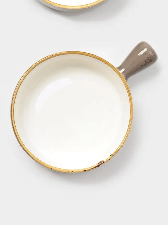 Пара коричневых кокотниц в крапинку — для тех, кто ищет баланс между уютом и практичностью. Каждая вмещает 500 мл: хватит на порцию жульена, овощной запеканки, сырного суфле или десерта — для одного или вдвоём. Фарфор без покрытия не вступает в реакцию с продуктами, не впитывает запахи и не теряет внешний вид даже после сотни циклов в духовке и посудомойке.