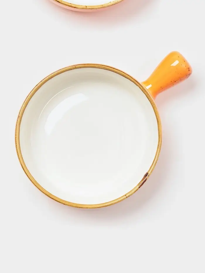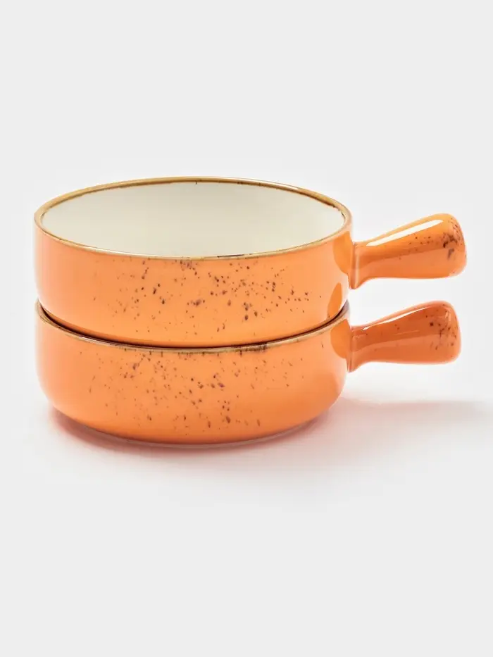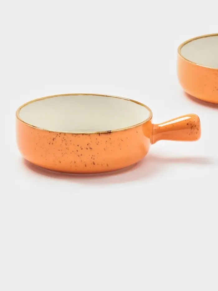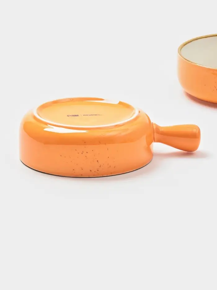 Пара оранжевых кокотниц в крапинку — для тех, кто не боится добавить характер в сервировку, не нарушая вкуса. Каждая рассчитана на 500 мл: хватит на порцию жульена, овощной запеканки, сырного суфле или десерта — для одного или вдвоём. Фарфор без покрытия не вступает в реакцию с продуктами, не впитывает запахи и не теряет внешний вид даже после частого использования.