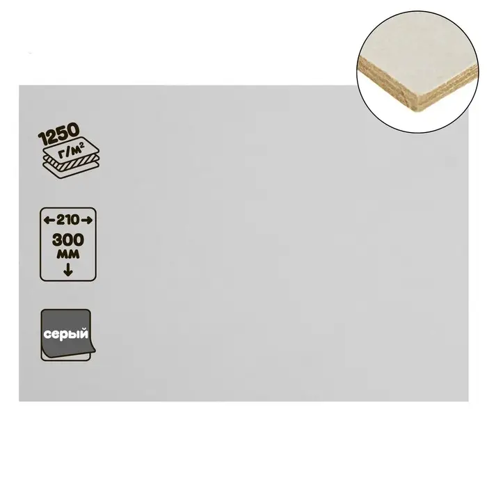 Картон переплётный (обложечный) 2.0 мм, 21 х 30 см, 1250 г/м2, серый