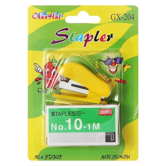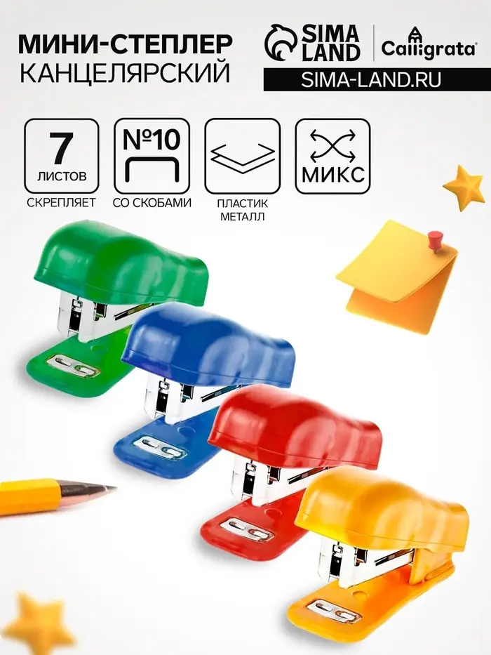 Мини - степлер канцелярский №10, Calligrata, до 7 листов, скобы в комплекте, в блистере, МИКС