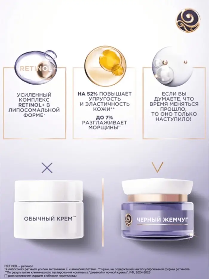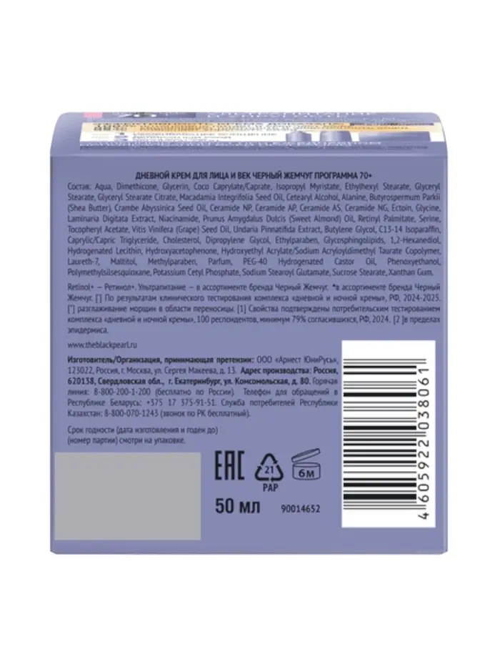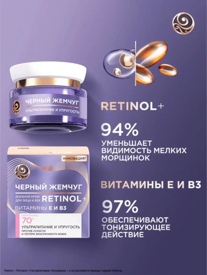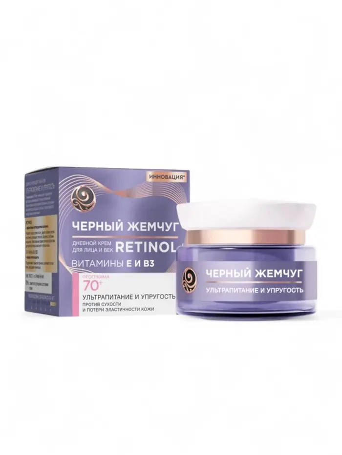 Дневной крем для лица и век с ретинолом Черный жемчуг — это косметическое средство для возрастной кожи, которое помогает бороться с морщинами, обеспечивает увлажнение и питание.