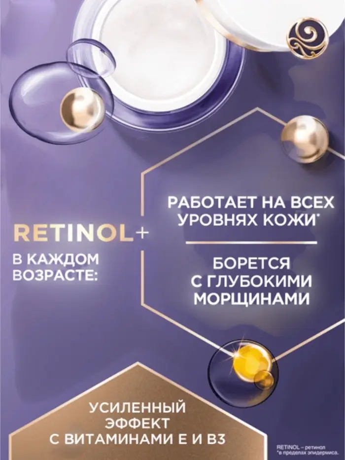 В состав входит ретинол — эффективный антивозрастной компонент, который делает кожу более упругой и эластичной, повышает ее плотность и борется с глубокими морщинами.