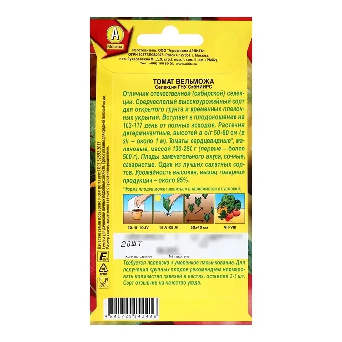 Семена Томат "Вельможа", детерминантный, низкорослый, 20 шт