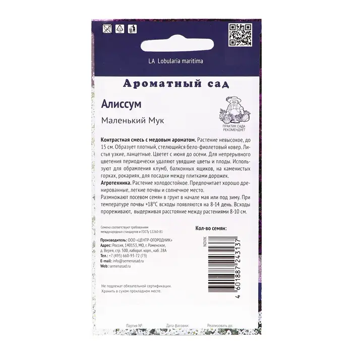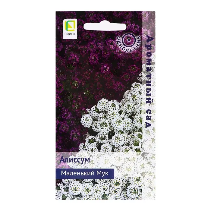 Контрастная смесь с медовым ароматом. Растение невысокое, до 15 см. Образует плотный, стелющийся бело-фиолетовый ковер. Листья узкие, ланцетные. Цветет с июня до осени. Для непрерывного цветения периодически удаляют увядшие цветы и плоды. Используют для обрамления клумб, балконных ящиков, на каменистых горках, рокариях, для посадки между плитками дорожек.Агротехника. Растение холодостойкое. Предпочитает хорошо дренированные, легкие почвы и солнечное место. Размножают посевом семян в грунт в начале мая или под зиму. При температуре почвы +18°С всходы появляются на 8-14 день. Всходы прореживают, выдерживая расстояние между растениями 8-10 см.Семена соответствуют требованиям международных стандартов и ГОСТу РФ 12260-81.