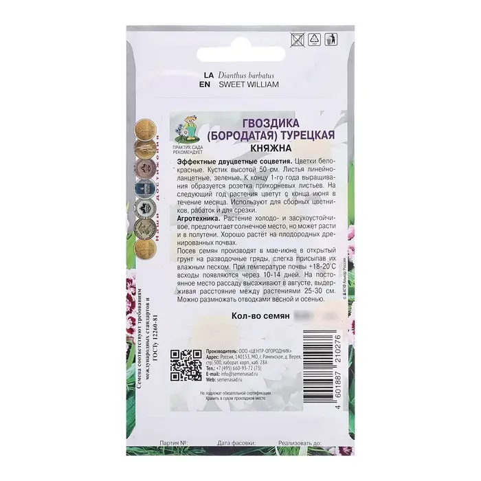 Эффектные двуцветные соцветия. Цветки бело-красные. Кустик высотой 40-45 см. Листья линейно-ланцетные, зеленые. К концу 1-го года выращивания образуется розетка прикорневых листьев. На следующий год растения цветут с конца июня в течение месяца. Используют для сборных цветников, рабаток и для срезки.Агротехника. Растение холодо- и засухоустойчивое, предпочитает солнечное место, но может расти и в полутени. Хорошо растёт на плодородных дренированных почвах. Посев семян производят в мае-июне в открытый грунт на разводочные гряды, слегка присыпав их влажным песком. При температуре почвы +18-20°C всходы появляются через 10-14 дней. На постоянное место рассаду высаживают в августе, выдерживая расстояние между растениями 25-30 см. Можно размножать отводками весной и осенью. Семена соответствуют требованиям международных стандартов и ГОСТу РФ 12260-81