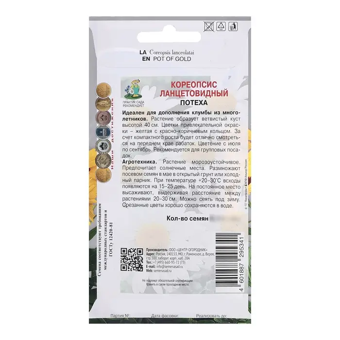 Идеален для дополнения клумбы из многолетников. Растение образует ветвистый куст высотой 40 см. Цветки привлекательной окраски - желтая с красно-коричневым кольцом. За счет компактного роста будет отлично смотреться на переднем крае рабаток. Цветение с июля по сентябрь. Рекомендуется для групповых посадок.Агротехника. Растение морозоустойчивое. Предпочитает солнечные места. Размножают посевом семян в мае в открытый грунт или холодный парник. На постоянное место высаживают, выдерживая расстояние между растениями 20-30 см. Можно сеять под зиму.Семена соответствуют требованиям международных стандартов и ГОСТу РФ 12420-81