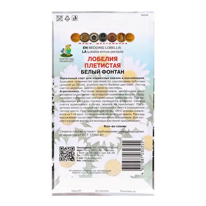 Идеальный сорт для подвесных корзин и контейнеров. Красивое травянистое растение со свисающими побегами (длиной до 30 см), усыпано чисто-белыми цветками. Листья светло-зеленые. Цветет с июня по сентябрь.Агротехника. Растение неприхотливое, наибольшей декоративности достигает на открытых солнечных местах. Предпочитает суглинистые или супесчаные почвогрунты. При выращивании рассады посевы проводят в феврале. Семена слегка вдавливают в почву, землей не присыпают. Посадочную емкость накрывают стеклом и ставят в освещенное теплое место. При температуре почвы +20°C всходы появляются на 7-14 день. Сеянцы пикируют в легкую землю. Рассаду высаживают после окончания весенних заморозков. Для лучшего кущения верхушки молодых растений прищипывают. Семена соответствуют требованиям международных стандартов и ГОСТу РФ 12260-81