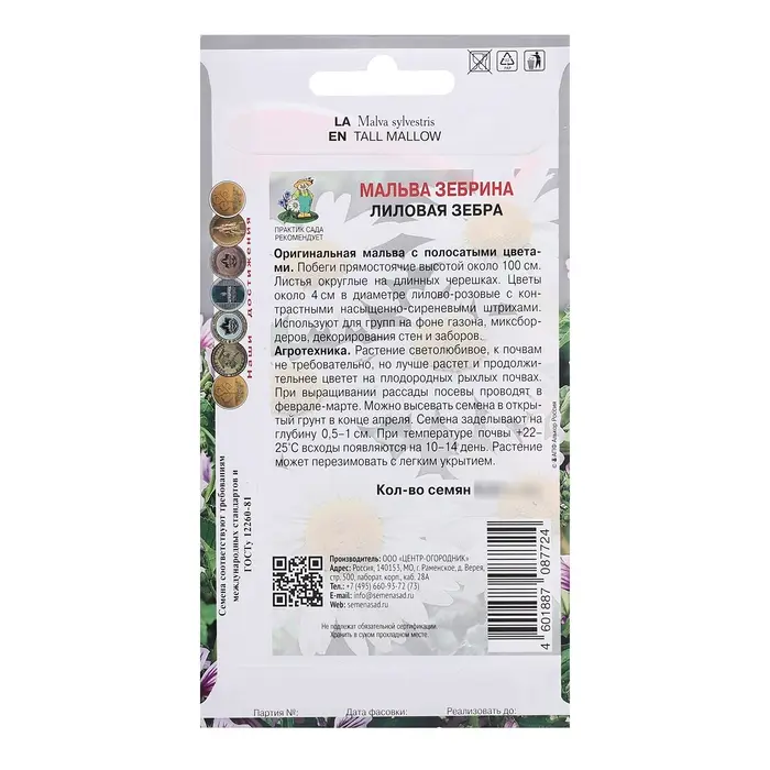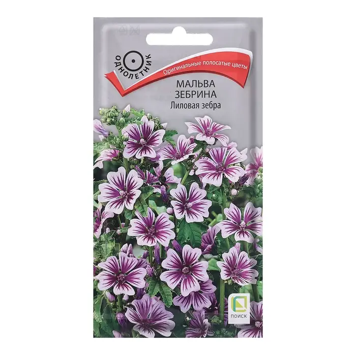 Оригинальная мальва с полосатыми цветами. Побеги прямостоячие, высотой около 100 см. Листья округлые, на длинных черешках. Цветы около 4 см диаметром лилово-розовые с контрастными насыщенно-сиреневыми штрихами. Используют для групп на фоне газона, миксбордеров, декорирования стен и заборов.Агротехника. Растение светолюбивое, к почвам не. требовательно, но лучше растет и продолжительнее цветет на плодородных рыхлых почвах. При выращивании рассады посевы проводят в феврале-марте. Можно высевать семена в открытый грунт в конце апреля. Семена заделывают на глубину 0,5-1 см. При температуре почвы +22-25°С всходы появляются на 10-14 день. Растение может перезимовать с легким укрытием. Семена соответствуют требованиям международных стандартов и ГОСТу РФ 12260-81